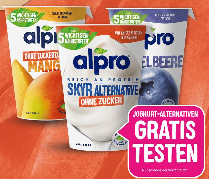 Die Alpro®- Soja-Joghurtalternativen sind reich an pflanzlichem Protein und super vielseitig. Ob Natur, ohne Zuckerzusatz oder fruchtig - immer lecker & cremig. Teilnehmende Produkte: - Alpro®- Soja-Joghurtalternativen 400g |