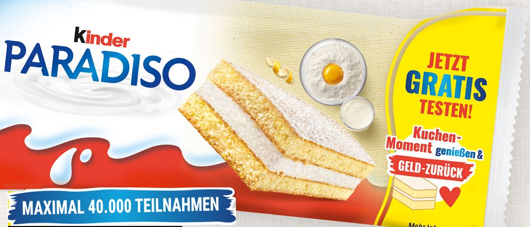 kinder PARADISO - Genieße deinen Kuchen-Moment! Teilnehmendes Produkt: - kinder PARADISO 4er Packung "JETZT GRATIS TESTEN" |