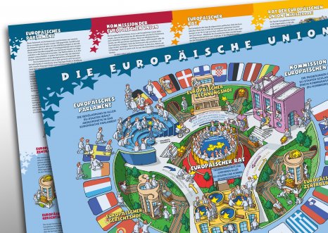 Das Schaubild zur Europäischen Union zeigt auf der Vorderseite alle Institutionen der EU und wie diese zusammenarbeiten. Auf der Rückseite werden alle vorn erwähnten Begriffe kindgerecht erklärt. |